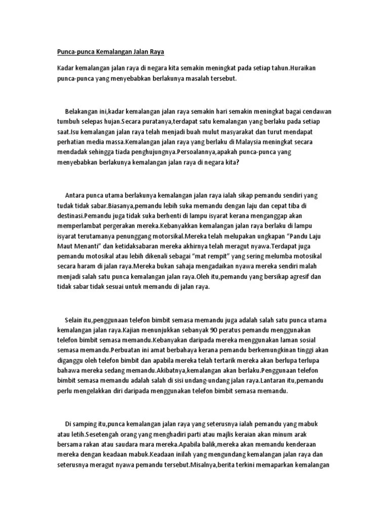 Kadar kematian jalan raya di negara kita semakin meningtkat. Tips karangan yang mudah difahami untuk membantu para pelajar menulis karangan yang lebih panjang. You can also bookmark this page with the url . Kadar kemalangan jalan raya di negara kita semakin meningkat pada setiap tahun. Apakah punca berlakunya kemalangan jalan raya dan langkah untuk mengatasinya. You can also bookmark this page with the url .